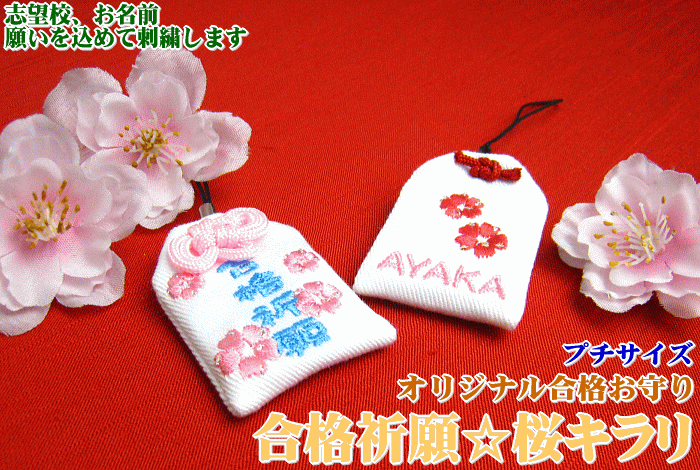 | ギフト対応のアイコンについて サイズ 【プチサイズ】 縦4.3cm 横3cm ひも15cm 生地素材 綿ツイル(綿100%) 表面 『合格祈願』桜キラリ 裏面 志望校、お名前など、 ご希望の文字を刺繍でお入れします 4、5文字程度以内 アルファベット、漢字、ひらがな ※文字の書体は丸ゴシック ひもオプション (+100円) ・首かけ用長ひも(45cm) ・携帯用ストラップ 納期 受注後1週間程度での発送お急ぎの場合はご相談ください。 ご注意 サイズ上、刺繍の特性として文字によっては読み辛くなる場合があります。 複雑な文字は漢字よりひらがなをオススメします。 作製前に出来上がりイメージのシミュレーション画像はお送りできません。 文字のご記入間違いには十分ご注意ください。 また、オーダーメイドのお品になりますので、イメージと違う等、機能不良、刺繍不良以外の返品はお受けできません。ご了承ください。 お守り袋って いえいえ、このお守り袋には神様やお告げは一切入っていません。 そこで代わりに入れていただきたいのが皆様の です。 そんな強い想いをこのお守り袋に入れて、いつも身近においていてください。 強い想いを表現できるように、お守り袋はオリジナルで製作。 や を 刺繍で一つ一つお入れ致します。 熱い想いと共に、皆様の元にもサクラ が咲きますように... 幼稚園・小学校のお受験、中学校・高校・大学入試、国家試験・教員免許試験など「合格」を願う気持ちをお入れください。 志望校、お名前、激励の言葉もオーダーメイドで刺繍するため、 世界に一つだけのお守り袋ができあがります。 大切なお子様、お孫さんへ…また彼氏さん、彼女さん、ともに戦った生徒さんへ… 気持ちの贈り物はいかがですか? 贈る方の年齢、性別、雰囲気、好みに合わせて、選べる多彩なデザインをご用意いたしました。 かわいい高校生の女の子には、キラキララインストーンのついたものを クールな息子さんには、大人っぽくもちやすいダルマデザインを 絶対に受かってほしい彼には、やっぱり満開の桜のデザインを… など、雰囲気に合わせて、ピッタリのひとつを見つけてください。 ? サイズ感と文字刺繍について ? 通常サイズ(縦7cm横5cm) 激励の言葉などメッセージを託したい方、お守り袋の中にお入れになりたいものがある方 通常サイズをオススメします。 お守り袋によりますが、10文字程度以内の文字を刺繍でお入れすることが可能です。 首からかけられる、ひもオプション:長ひも(+100円)が選んでいただけます。 ??????????????????????????????????? ロングサイズ(縦8cm横3.5cm) 通常サイズよりも小柄で持ちやすく、プチサイズよりも文字がたくさん入る、便利なサイズです。 市販のお守り袋に一番よく似た形で、誰でも身に着けやすいサイズになっています。 お守り袋によりますが、5?12文字程度以内の文字を刺繍でお入れすることが可能です。 首からかけられる、ひもオプション:長ひも(+100円)が選んでいただけます。 ?????????????????????????????????????????????? プチサイズ(縦4.3cm横3cm) お名前、志望校のみをお入れになる方、携帯ストラップに、さりげない大きさがよい方、 プチサイズをオススメします。 4?5文字程度以内の文字を刺繍でお入れすることが可能です。 ひもオプション:携帯ストラップ(+100円)、首からかけられるひもオプション:長ひも(+100円)が選んでいただけます。 オリジナルの文字が入ったお守り袋は、ご注文確認後、 ひとつひとつデータ作成し刺繍していきます。 全ての商品を一つ一つ、職人が丹精込めて縫製しています。 桜の花の微妙な色合いも、ダルマの小さな目一つもすべて 刺繍で仕上げています。 あなたの大切な想いを、丁寧に仕上げます。 受験でピリピリモード、 緊張感と不安に押しつぶされてしまいそうな時だからこそ、 ほっと心のなごむ、その「瞬間」をお贈りください。 みつばでは、贈り物にもきちんと感を!ということで、 無料、有料ラッピング、共にご用意しております。 大切な方へ、気持ちの贈り物、 きっと喜ばれること、間違いなしです。 ■ご注文はこちらから■